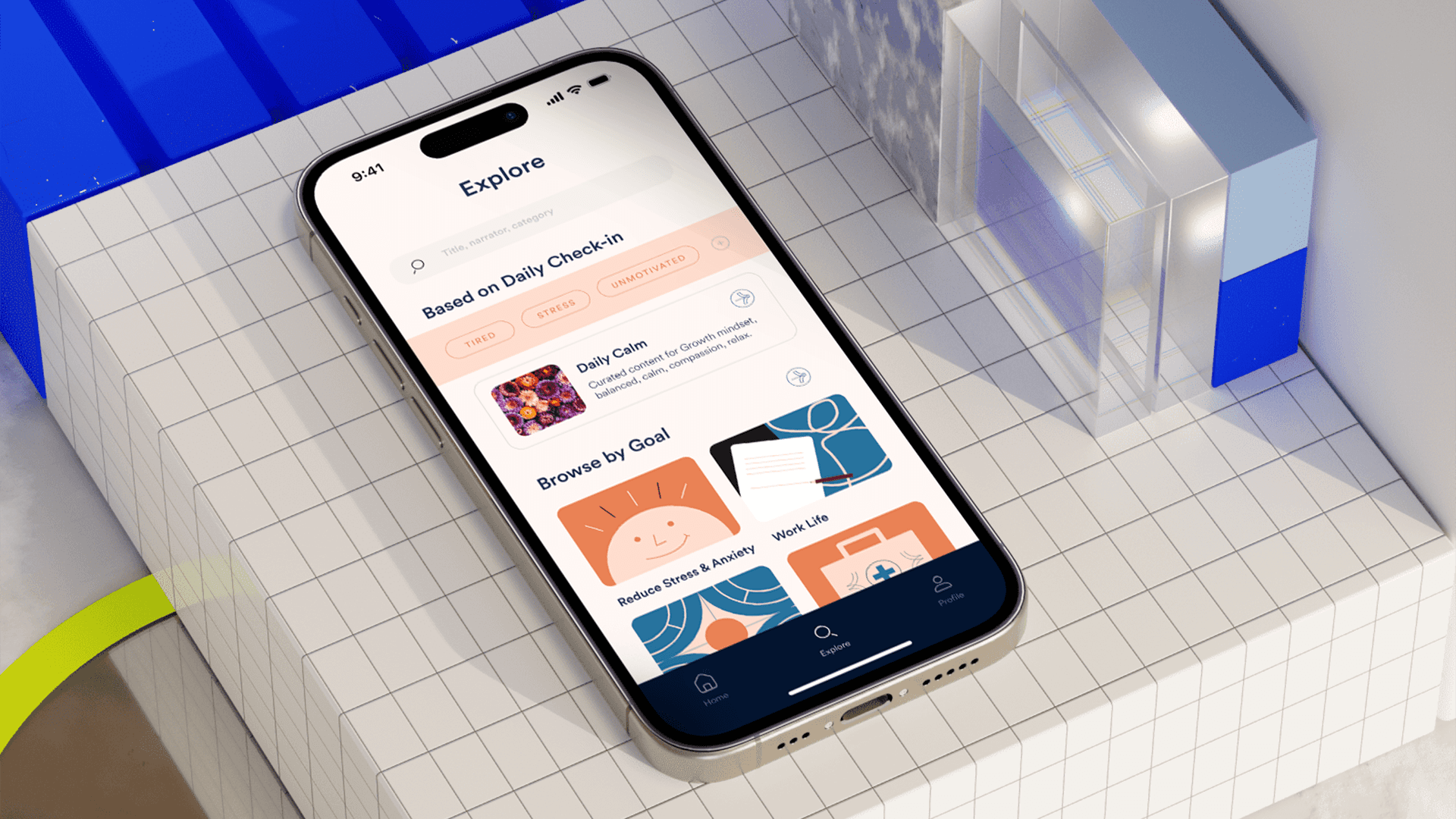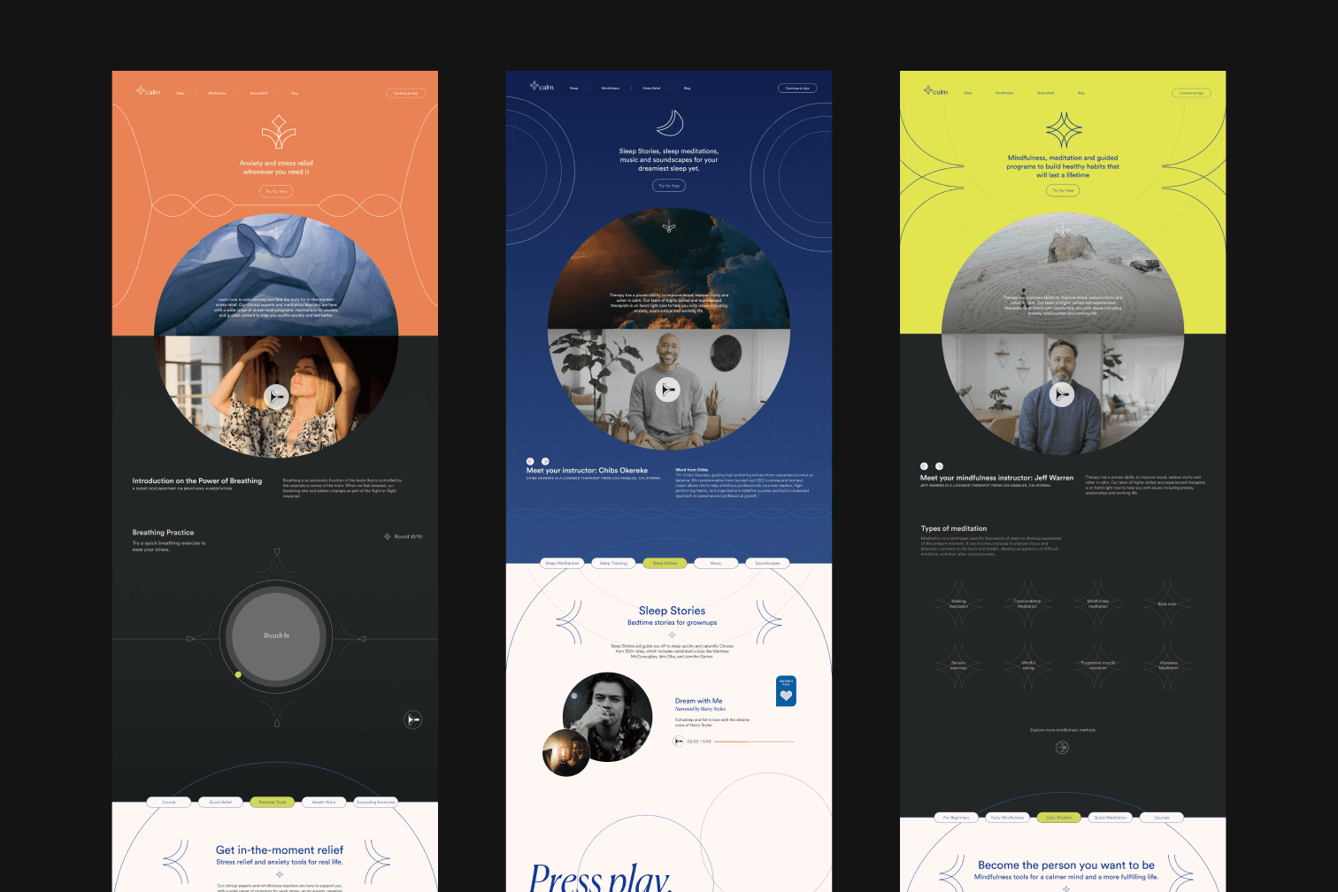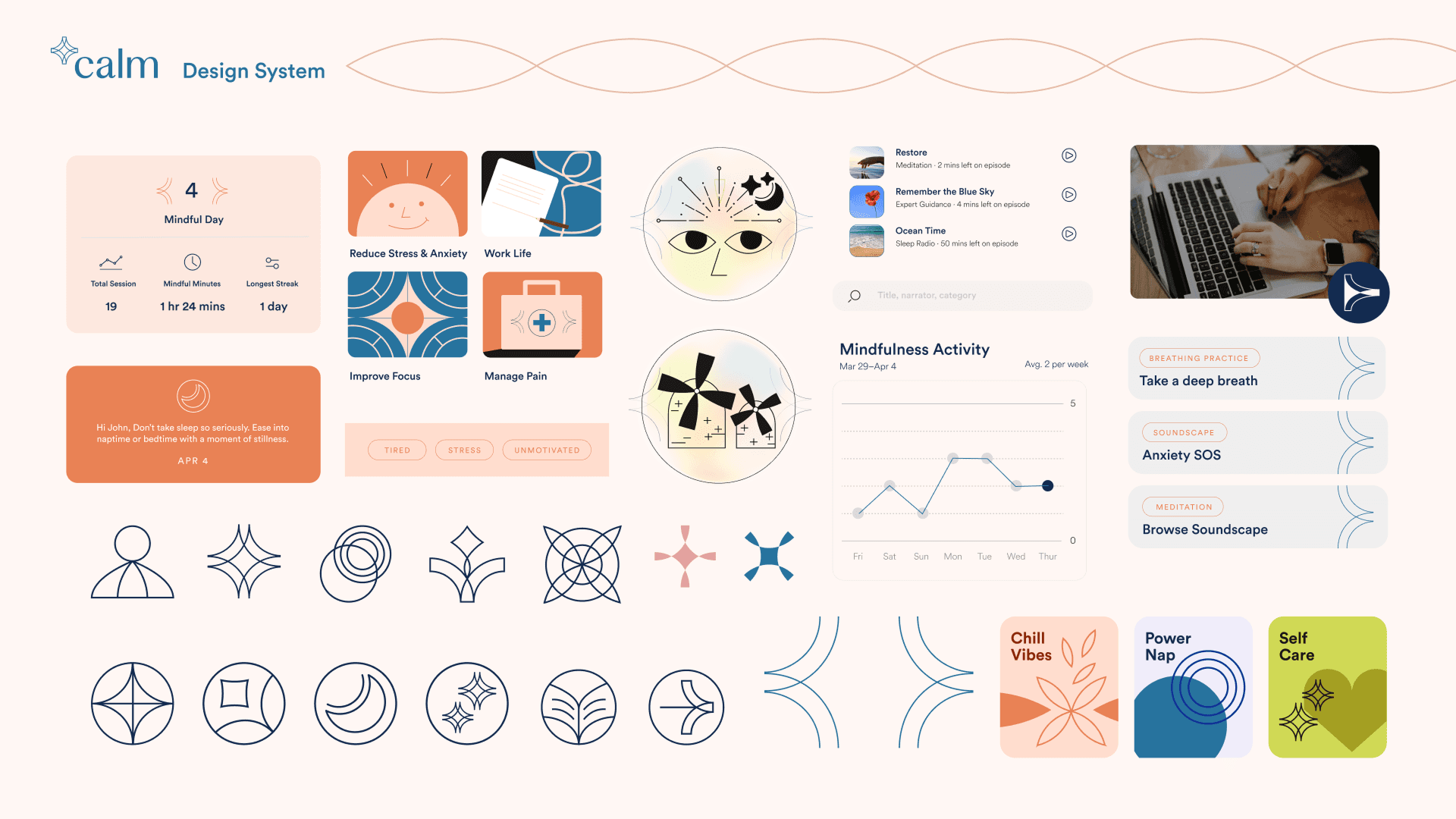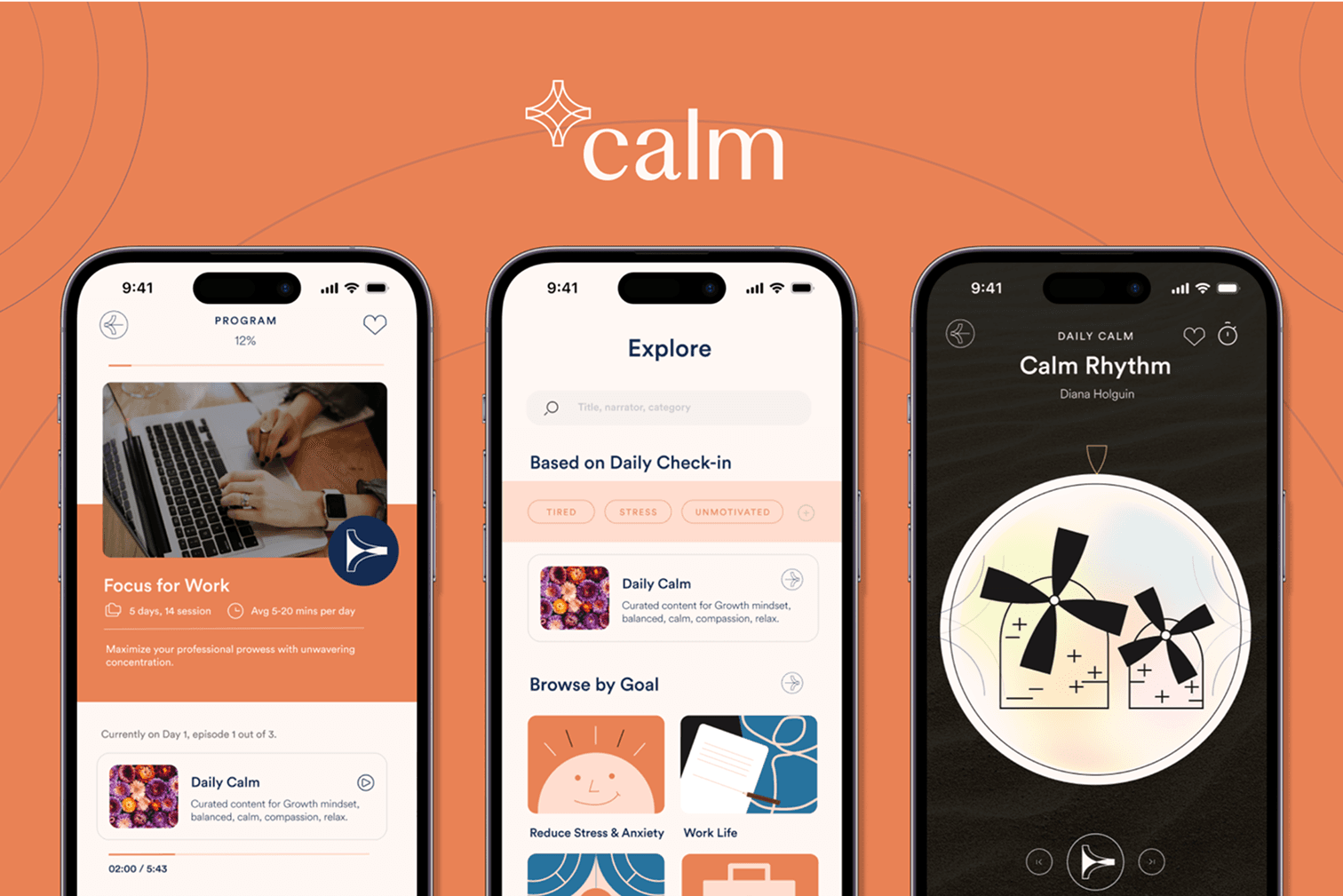 Hypothetical rebrand for Calm that repositions the app as a mindful companion for users' mental health journeys. The redesign curates personalized guidance and conversational programs, transforming Calm from a resource library into something more personal.