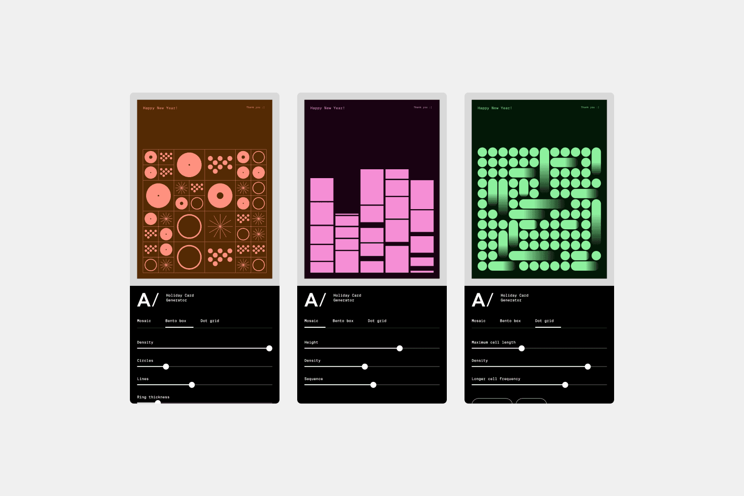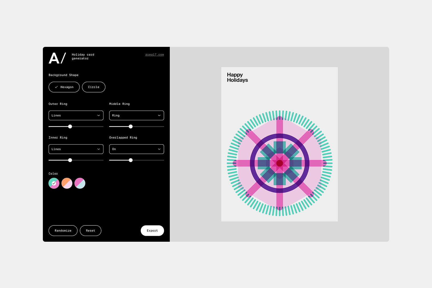 Created as a core apprentice individual project for design agency AREA 17, this brand assets tool opens up design creation to everyone, allowing non-designers to build their own branded experience. The project was designed, coded by me, and launched under AREA 17 during the 2024 holiday season.